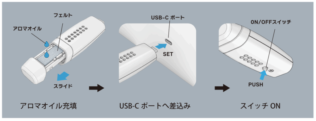 USB type-C対応で、車やパソコンでも気軽に使えるアロマディフューザー。ほのかに広がる香りと優しいLEDライトが、リラックスできる上質な空間を演出します。加熱式アロマで香りを穏やかに持続し、小型軽量デザインで持ち運びもスマート。オンにするだけで、自分だけの癒し空間が広がります。