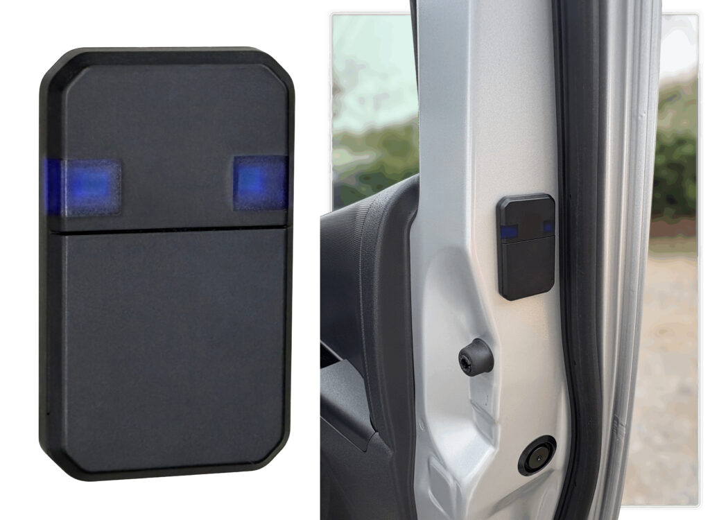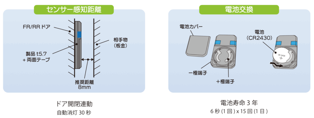 電池式だから車両配線は一切不要。センサーがドアの開放を瞬時に検知し、夜間の後方安全をサポートするLEDライトが点灯。LEDは2灯がしっかりと存在感を示し、後続車や歩行者にドアの存在を知らせます。